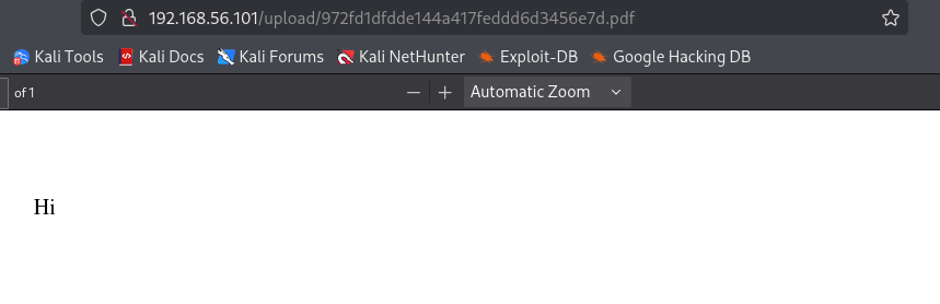 Cool, the 'Hi' shows up in the PDF! Let’s grab the file and run exiftool on it , maybe we can find out what tool was used to generate it.