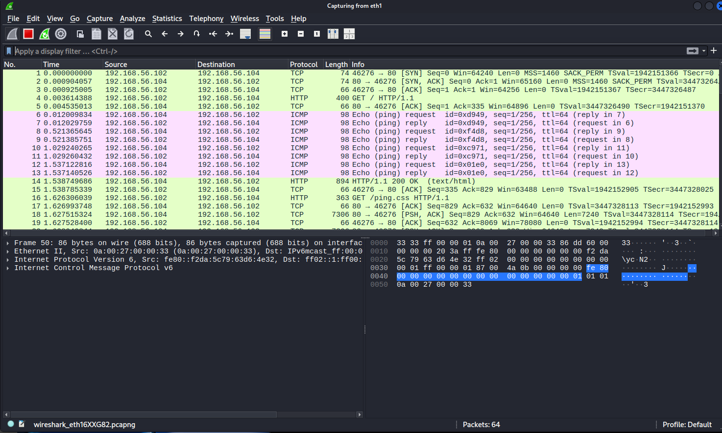 Let’s open Wireshark using sudo wireshark, and then visit the site at 192.168.56.104 to see if it pings us.