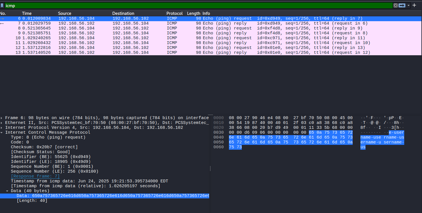 The output indicates that the file /root/root.txt is being transmitted in 21 separate ICMP echo request packets to our machine (192.168.56.102). Just like with the user flag, we captured these packets using Wireshark