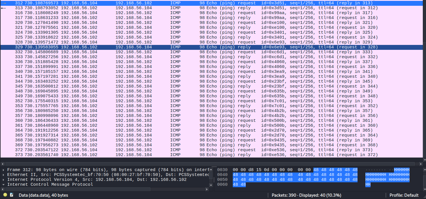 We can see that it sends us packets numbered from 312 to 373. We'll focus only on the ICMP request packets within this range, extract their data, and assemble it to reveal the user flag.