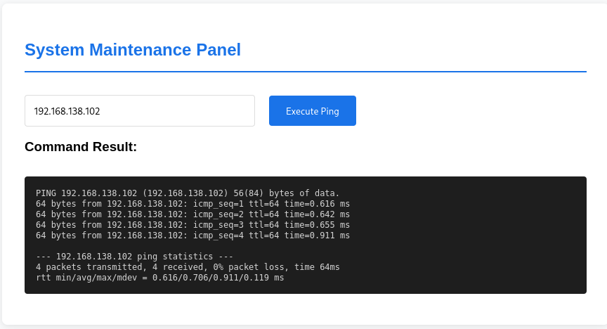 Next, we attempted a command injection by using special characters like && , \n and , ; and| to try and execute additional commands. Fortunately, one of these attempts worked successfully. I remember this was the same thing done on the DVWA platform.